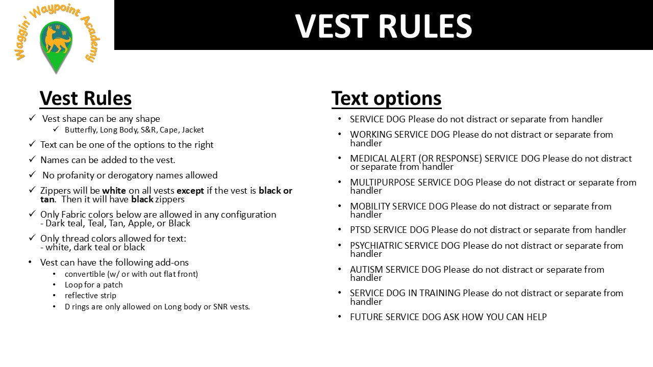• Program Clients are allowed to purchase as long as you provide the program code.  Any unauthorized purchases will be canceled subject to a 10% cancelation fee.  Normal custom vest listings are listed in the shop