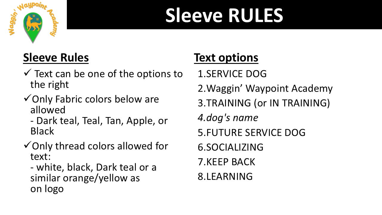 This adjustable vest will be designed for you. You choose the colors of the vest and it will be machine embroidered per your request. Both the waist belt and neck belt are adjustable so they will fit many dogs. The belly strap has a quick release buckle for easy on and off. This vest is made to order.