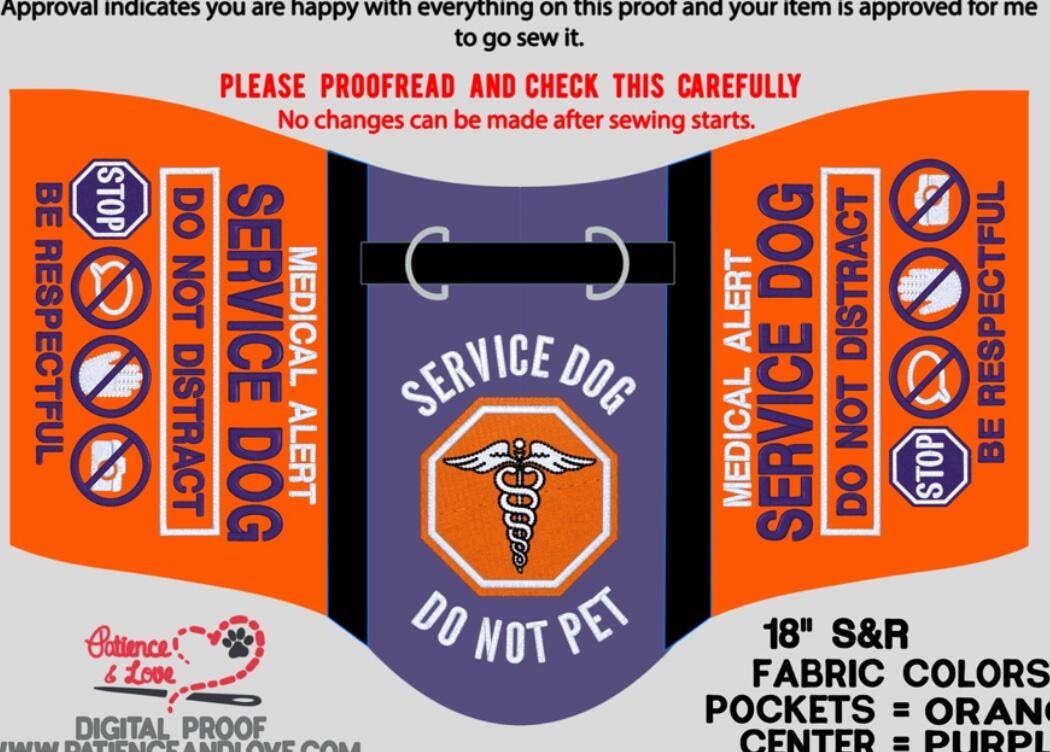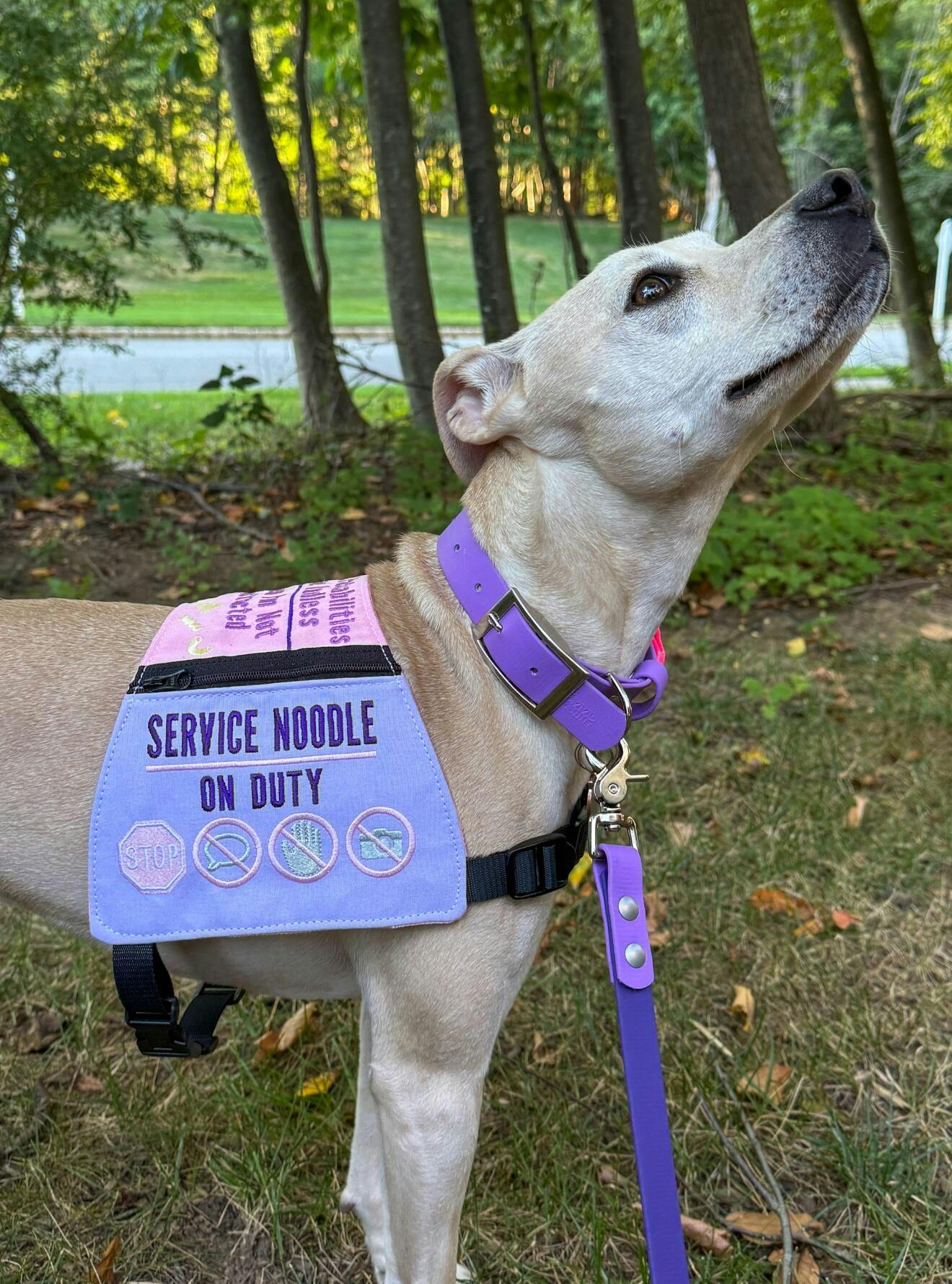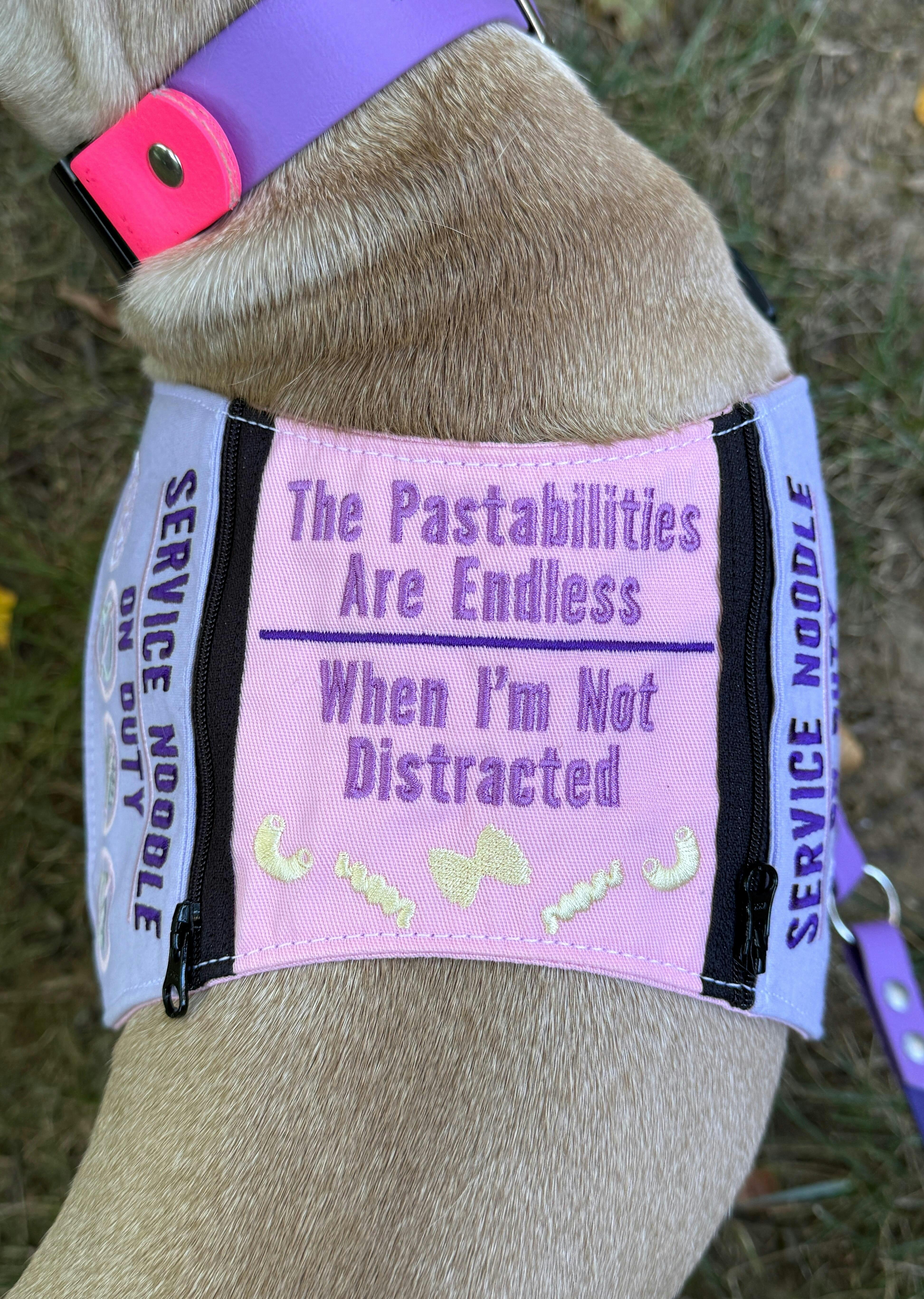 I got a Noodle themed vest for my SDiT, Noodle, and I am absolutely in love with how it came out. I worked hard on coming up with a concept, but I am not artistic in the slightest. But they were able to bring it to life even better than I could have imagined and I’m thrilled. My dog also loves Patience & Love vests because they are a bit more lightweight and she’s not gear shy, but she does definitely prefer wearing less or more comfortable gear. I can relate haha. So, overall I can’t say enough about how happy I am with how this vest turned out. And the process from when I placed my order to when it showed up at my door was so much faster than I thought it would be!! Love that!!! Thank you so much!!