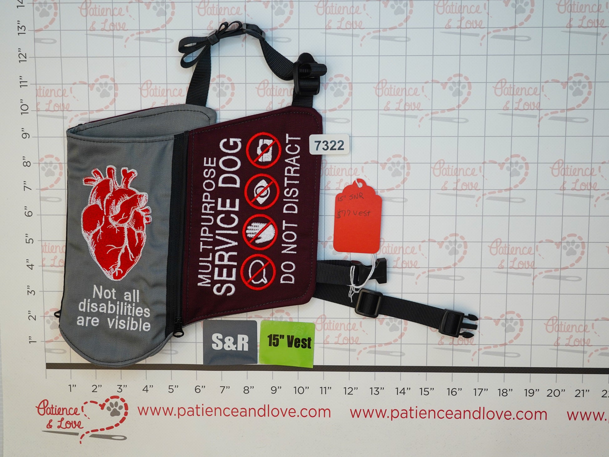 This adjustable vest will be designed for you. You choose the colors of the vest and it will be machine embroidered per your request. Both the waist belt and neck belt are adjustable so they will fit many dogs. The belly strap has a quick release buckle for easy on and off. This vest is made to order.